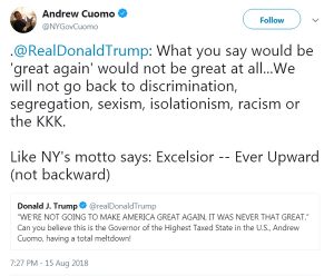 আর্ন্তজাতিক ডেস্ক: ‘আমেরিকাকে আবার মহিমান্বত করো’ এ স্লোগান দিয়ে প্রেসিডেন্ট বনে গেছেন ডোনাল্ড ট্রাম্প। তার বক্তব্য ও টুইটের আগে পরে থাকে এ স্লোগান। কিন্তু এবার নিউ ইয়র্কের গভর্নর অ্যান্ড্রু কুমো জানিয়ে দিয়েছেন, আমেরিকাকে আমরা আবার মহান করতে যাচ্ছি না। কারণ আমেরিকা কখনই তেমন মহানই ছিল না!