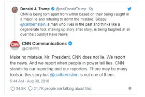 সাবেক মার্কিন প্রেসিডেন্ট রিচার্ড নিক্সনের সময়কালে ওয়াটার গেট কেলেঙ্কারি বিষয়ে প্রতিবেদন তৈরি করে বিশ্বব্যাপী পরিচিতি পাওয়া সাংবাদিক ‘কার্ল বার্নস্টাইন’কে পাপী আখ্যা দিয়ে আরও ট্রাম্প লিখেছেন, ‘সে অতীতে বসবাস করছে। তার চিন্তা-ভাবনা বোকাদের মতো। একের পর এক আষাড়ে গল্প ফাঁদছে সে। সারা দেশে তাকে নিয়ে হাসাহাসি করা হয়।’