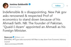 এ বিষয়ে টুইটারে জেমিমা লিখেছেন, ‘অসমর্থযোগ্য এবং খুবই হতাশাজনক। পাকিস্তানের নতুন সরকার অর্থনীতির প্রখ্যাত এবং শ্রদ্ধেয় অধ্যাপককে সরিয়ে দিয়েছে তার আহমেদিয়া মতবাদে বিশ্বাসের জন্য। উল্লেখ্য: পাকিস্তানের প্রতিষ্ঠাতা কায়েদ ই আজম আহমেদিয়া মতবাদে বিশ্বাসী একজনকে নিজের পররাষ্ট্রমন্ত্রী হিসেবে নিযুক্ত করেছিলেন।’