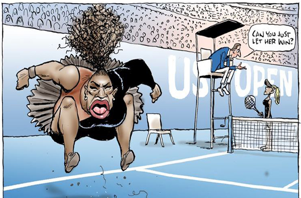 সেরেনাকে নিয়ে ওই কার্টুন মঙ্গলবার প্রকাশিত হয়েছে হেরাল্ড সান ট্যাবলয়েডে। যে কার্টুন ঘিরে টেনিস মহলে বিতর্কের ঝড় উঠেছে। কার্টুনটি তৈরি করেছেন মার্ক নাইট। ইউএস ওপেনে সেরেনার ঔদ্ধত্য আচারণ তুলে ধরা হয়েছে ওই কার্টুনে। যা নিয়ে সামাজিক যোগাযোগ মাধ্যমে চলছে তোলপাড়।