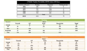 গ্রামীণফোন থেকে বাংলালিংকে মোট আবেদন করেছে এক হাজার ২৪১টি। এর মধ্যে সফল হয়েছে ৪৫০টি এবং বাতিল হয়েছে ৭৯১টি। গ্রামীণফোন থেকে টেলিটকে আবেদন করেছে ৪৪ জন গ্রাহক। এর মধ্যে সফল হয়েছে ২৮টি এবং বাতিল হয়েছে ১৬টি।
