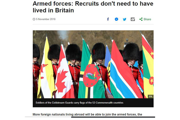 ব্রিটেনের সেনাবাহিনীতে কমনওয়েলথের নাগরিকরা সবসময়ই যোগ দিতে পারতেন। তবে শর্ত হচ্ছে আবেদন করার আগে তাকে অন্তত পাঁচ বছর ব্রিটেনে বসবাস করতে হবে।