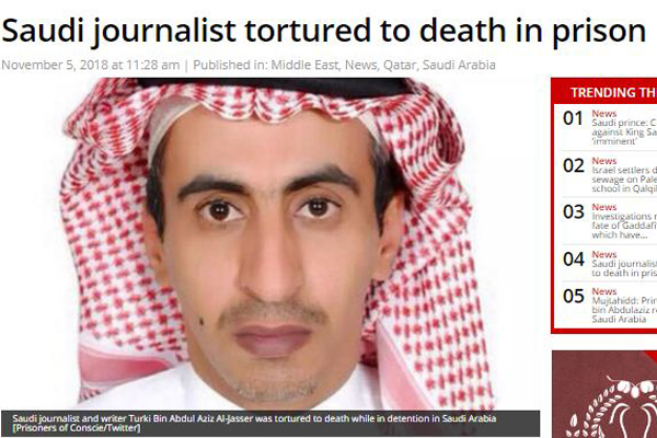 সৌদি কর্তৃপক্ষ ও রাজপরিবারে সংঘটিত নানা ঘটনার তথ্য ফাঁসের অভিযোগে সাংবাদিক ও লেখক তুর্কি বিন আবদুল আজিজকে গ্রেফতার করে দেশটির পুুলিশ। গ্রেফতারের পর পুলিশের কাছে আটক অবস্থায়ই দিনের পর দিন নির্যাতন করে তাকে হত্যা করা হয়েছে বলে দাবি করেছে সংবাদ মাধ্যমটি।