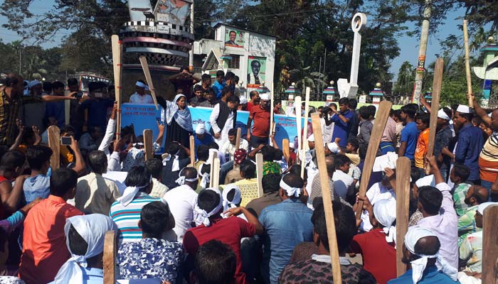 স্থানীয়রা জানান, মাথায় কাফনের কাপড় বেঁধে ও হাতে বৈঠা হাতে রাস্তায় বসে বিক্ষোভ করছেন নেতা-কর্মীরা। এতে সড়কের দুই পাশে বিপুল সংখ্যক যানবাহন আটকা পড়েছে।