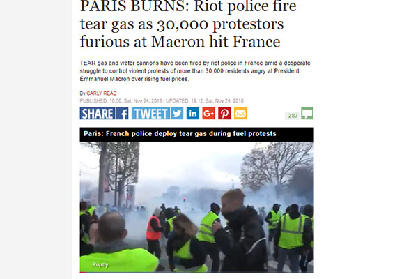 শনিবার প্যারিসে পথে নামেন অন্তত ৩০ হাজার বিক্ষোভকারী। এসময় বিক্ষোভকারীদের দমাতে টিয়ারসেল ও জলকামান ব্যবহার করা হয়। এসময় অন্তত ১৮ জনকে গ্রেফতার করেছে পুলিশ। যদিও বিক্ষোভকারীদের দাবি, তারা শান্তিপূর্ণ ভাবেই মিছিল করছিলেন। এদিকে এর এক সপ্তাহ আগে দেশজুড়ে অন্তত ৩ লাখ মানুষ রাস্তা অবরোধ করেছিলেন।
