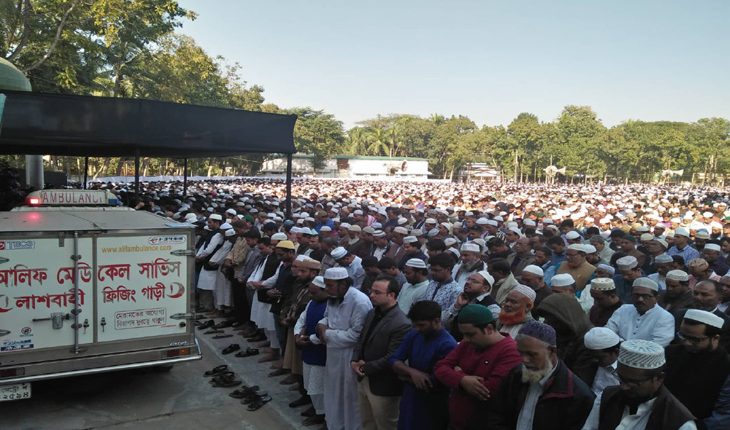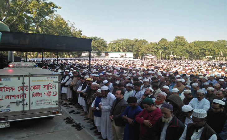 রবিবার (৬ জানুয়ারি) বিকাল ৩টার দিকে জানাযায় জনতার ঢল নামে। দলমত নির্বিশেষে সর্বস্তরের মানুষ এই জানাজায় অংশ নেয়।