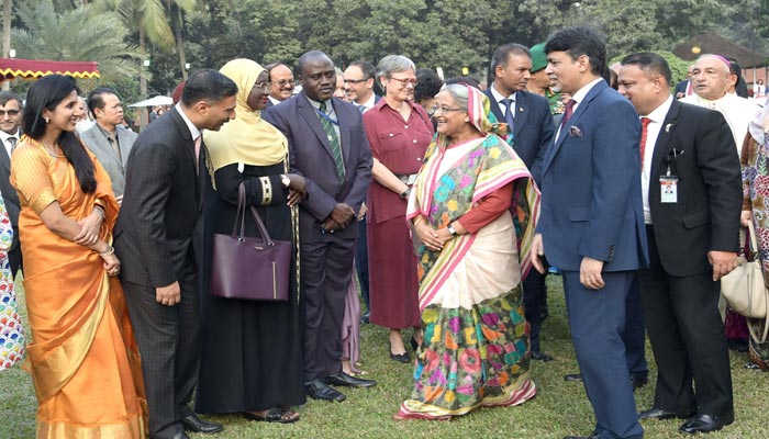 প্রধানমন্ত্রী বিকাল ৪টা ১০ মিনিটে অনুষ্ঠানস্থলে আসেন এবং বাংলাদেশে নিযুক্ত ৪৮টি দেশের রাষ্ট্রদূত, হাইকমিশনার ও চার্জ দ্য অ্যাফেয়ার্সের পাশাপাশি আন্তর্জাতিক সংস্থাগুলোর মিশন প্রধান ও প্রতিনিধিদের সাথে কুশল বিনিময় করেন। তিনি অতিথিদের সাথে কথা বলেন এবং তাদের খোঁজখবর নেন।