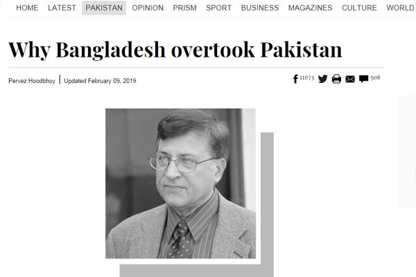 পাকিস্তানের চেয়ে বাংলাদেশ কেন এগিয়ে তার কারণ ব্যাখ্যা করে ‘দ্য ডন’- এ ৯ ফেব্রুয়ারি উপসম্পাকীয় লিখেছেন পাকিস্তানের পদার্থবিদ পারভেজ হুদবয়। তিনি লিখেছেন,১৯৭১ সালে মুক্তিযুদ্ধে বড় পরাজয়ের পর নিজের নাম পাল্টে ফেলে পাকিস্তান (পূর্বে ছিল পশ্চিম পাকিস্তান)। তারা ভেবেছিল পূর্ব পাকিস্তান (বর্তমানে বাংলাদেশ) ফের তাদের সঙ্গে একত্রিত হতে চাইবে। যেটা শেষ পর্যন্ত হয়নি।
