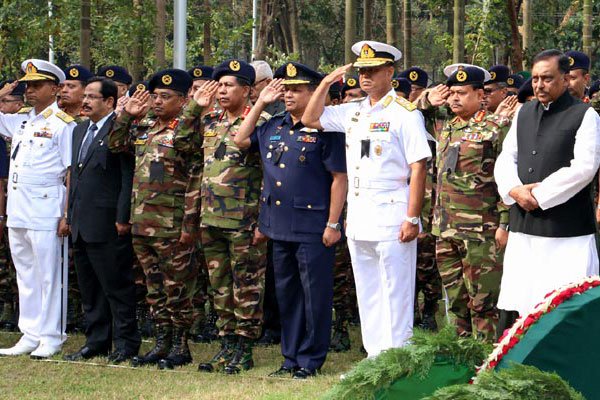 এরপর স্বরাষ্ট্রমন্ত্রী আসাদুজ্জামান খাঁন কামাল, সেনাবাহিনী প্রধান জেনারেল আজিজ আহমেদ, নৌবাহিনী প্রধান ভাইস অ্যাডমিরাল এ এম এম এম আওরঙ্গজেব চৌধুরী, বিমান বাহিনী প্রধান এয়ার চিফ মার্শাল মাসিহুজ্জামান সেরনিয়াবাত, সম্মিলিতভাবে বর্ডার গার্ড বাংলাদেশের মহাপরিচালক মেজর জেনারেল মো. সাফিনুল ইসলাম ও স্বরাষ্ট্র মন্ত্রণালয়ের জননিরাপত্তা বিভাগের সচিব মোস্তাফা কামাল উদ্দীন ফুল দিয়ে শ্রদ্ধা জানান।