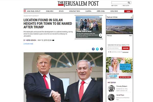 আর্ন্তজাতিক ডেস্ক: গোলান উপত্যকায় যুক্তরাষ্ট্রের প্রেসিডেন্ট ডোনাল্ড ট্রাম্পের নামে শহর গড়ে তোলা হবে। ইতোমধ্যে এই শহরের জন্য জায়গা নির্দিষ্ট করা হয়েছে বলে জানিয়েছেন ইসরায়েলের প্রধানমন্ত্রী বেনজামিন নেতানিয়াহু।