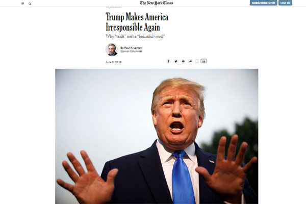 আর্ন্তজাতিক ডেস্ক: ২০১৭ সালে ক্ষমতাগ্রহণের পর বিভিন্ন দেশের ওপর শুল্ক আরোপ করেছেন যুক্তরাষ্ট্রের প্রেসিডেন্ট ডোনাল্ড ট্রাম্প। শুল্ক আরোপের কারণে বর্তমানে অন্যতম অর্থনৈতিক পরাশক্তি চীনের সঙ্গে যুক্তরাষ্ট্রের বাণিজ্যযুদ্ধ চলছে। প্রতিবেশী দেশ মেক্সিকোর ওপরও শুল্ক আরোপের ঘোষণা দিয়েছেন ট্রাম্প। তার সমালোচনা করে নিউ ইয়র্ক টাইমসে কলাম লিখেছেন নোবেলজয়ী অর্থনীতিবিদ পল ক্রুগম্যান।