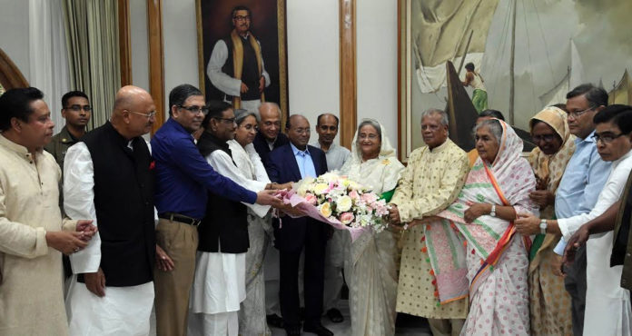 আজ অপরাহ্নে প্রধানমন্ত্রীর সরকারি বাসভবন গণভবনে দলীয় নেতা-কর্মী এবং শুভানুধ্যায়ীরা ফুলের তোড়া দিয়ে শেখ হাসিনাকে এই শুভেচ্ছা জানান।