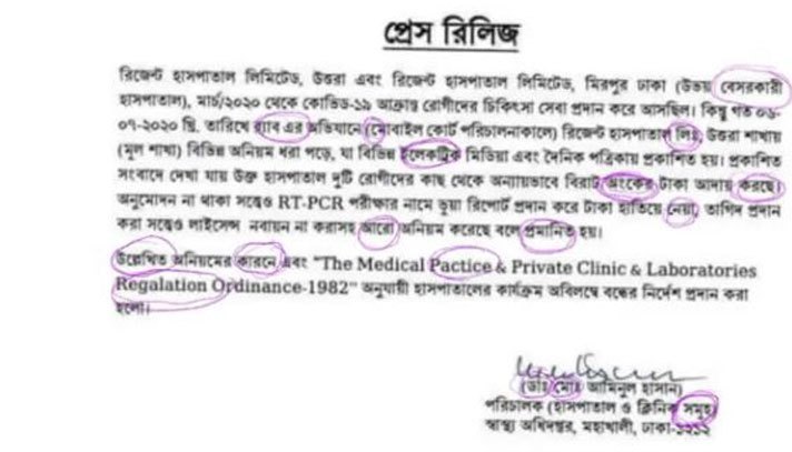 বিজ্ঞপ্তির কোনো কোনো লাইনে একাধিক ভুলও রয়েছে। ভুলগুলোর মধ্যে বাংলা শব্দ ১৫টি ও ইংরেজি শব্দ দুটি। নভেল করোনাভাইরাসে আক্রান্ত রোগীদের চিকিৎসা দেওয়ার নাম করে অনিয়ম-দুর্নীতি ও প্রতারণা করায় ঢাকার রিজেন্ট হাসপাতাল লিমিটেড, উত্তরা এবং রিজেন্ট হাসপাতাল লিমিটেড, মিরপুরে অভিযান চালিয়ে প্রতারণার প্রমাণ পায় এবং মামলা করে র্যাব।