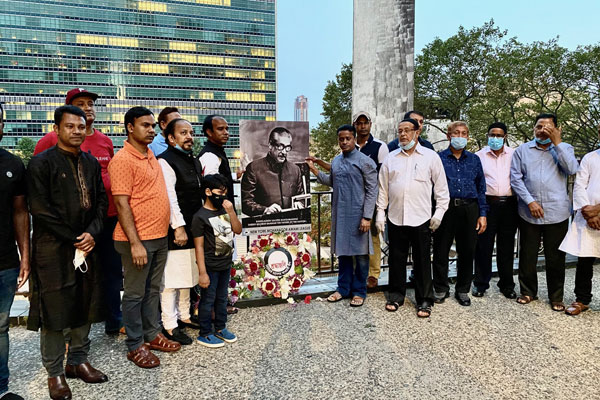 জাতিসংঘের সামনে বঙ্গবন্ধুর প্রতিকৃতিতে শ্রদ্ধা
